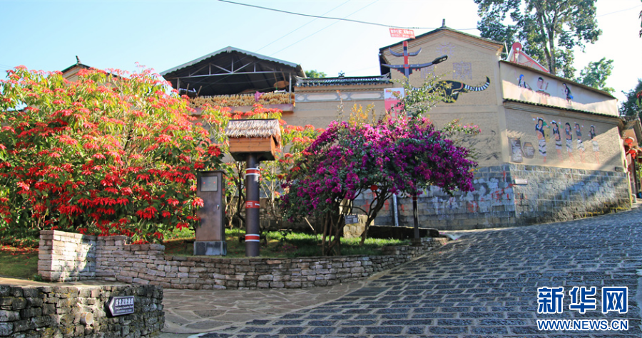 ??來(lái)到國(guó)門新村,遠(yuǎn)遠(yuǎn)便能看到由“刀山火?!?、火炬、三弦琴、箭及裝飾物組成“一把弩”形狀的寨門。
