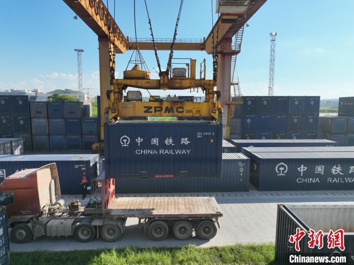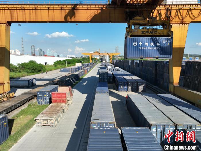 8月26日,廣西南寧國際鐵路港內(nèi),鐵路職工頂著下午的烈日,正在為發(fā)往越南的貨運(yùn)班列裝卸貨物。該鐵路港是廣西始發(fā)中越班列的核心場站。國鐵南寧局提供的信息顯示,今年前7個月,廣西始發(fā)中越班列累計發(fā)運(yùn)貨物6850標(biāo)箱,同比增長16倍;其中7月份發(fā)運(yùn)1922標(biāo)箱,超過今年一季度發(fā)運(yùn)量總和,為今年以來第三次刷新單月發(fā)運(yùn)量紀(jì)錄。圖為集裝箱擺滿場站,等待裝車。王以照 攝
