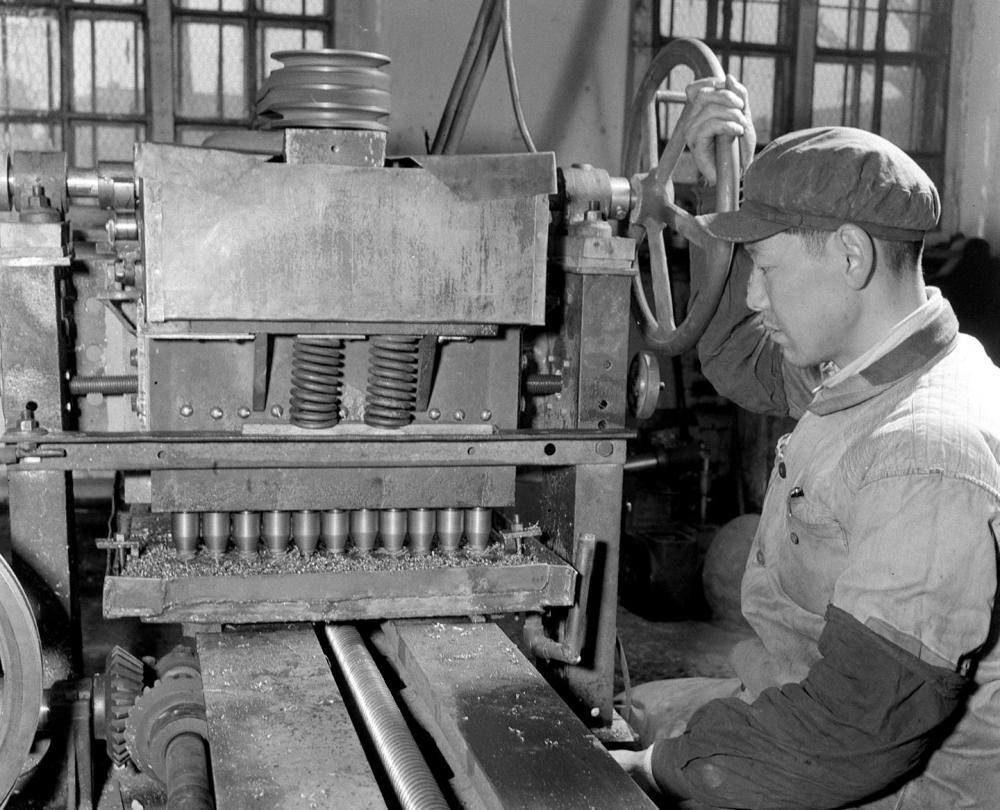 1958年2月12日,哈爾濱機(jī)聯(lián)機(jī)械廠四車(chē)間老工人宋振東(鉗工),經(jīng)過(guò)一月多的刻苦鉆研,創(chuàng)造出一臺(tái)多頭鉆床,它的生產(chǎn)效率比一般鉆床要提高效率11倍。新華社記者佟德印攝