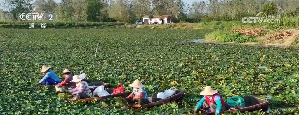 傍晚時(shí)分,采菱的村民劃著小船穿梭在碧波綠葉中,從水下扯起一根根菱角藤,采摘綠中帶粉的菱角。不一會(huì)兒,船艙就被塞得滿滿當(dāng)當(dāng)。