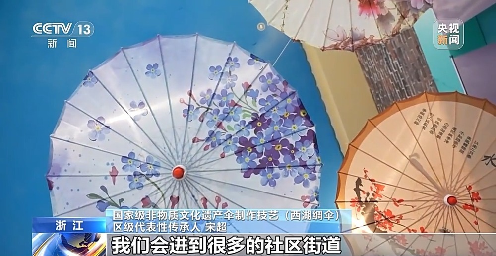 國家級非物質(zhì)文化遺產(chǎn)傘制作技藝(西湖綢傘)區(qū)級代表性傳承人 宋超:我們會進(jìn)到很多的社區(qū)街道,我們會進(jìn)到中小學(xué)的校園、博物館、非遺展示館等等這樣的地方,去進(jìn)行我們西湖綢傘技藝的展示展覽,包括各種各樣的體驗活動,以此讓更多人了解和認(rèn)識到我們西湖綢傘這項技藝。