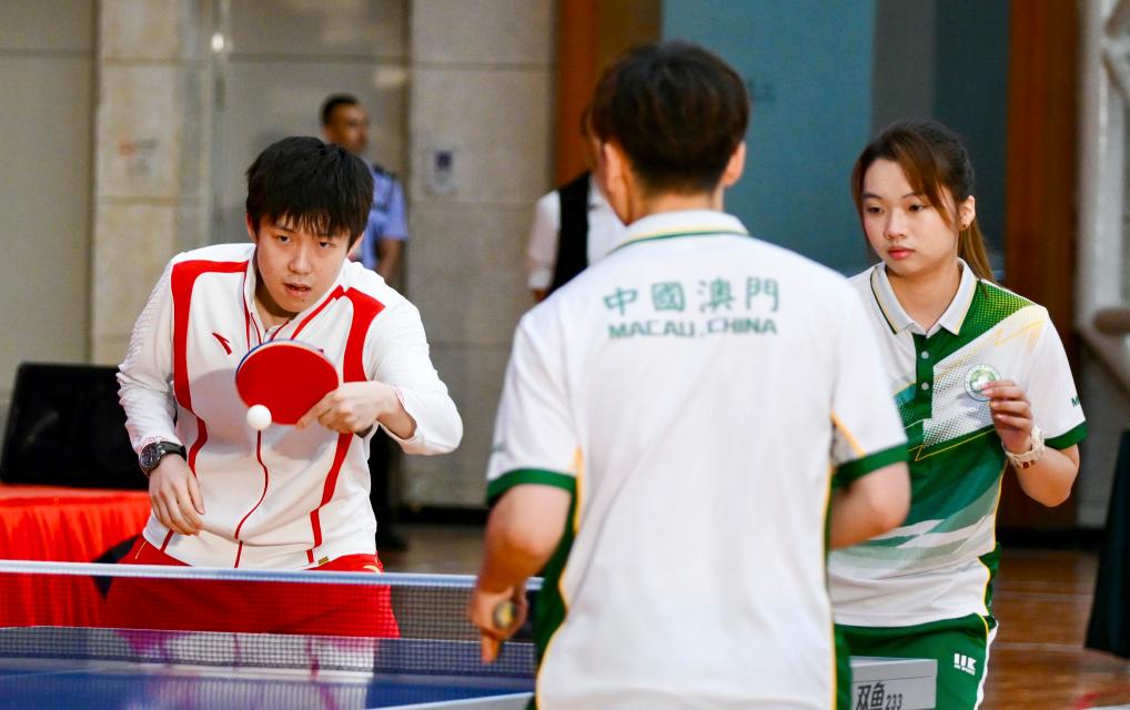 9月1日,乒乓球運動員王楚欽(左)與澳門運動員切磋球技。新華社記者 郭雨祺 攝