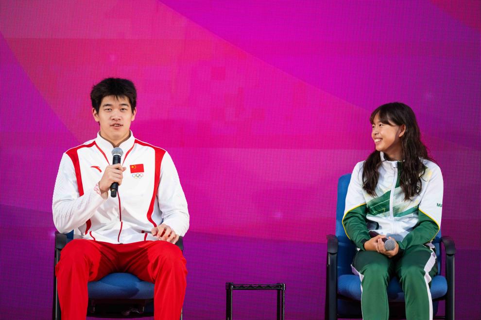 9月1日,游泳運動員潘展樂(左)在活動中回答澳門運動員的提問。新華社記者 張金加 攝