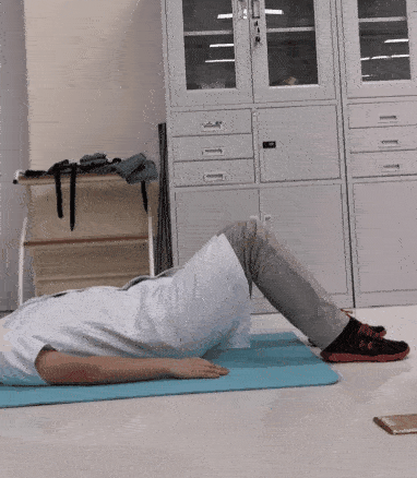 平躺在墊子上,雙腿分開,與肩同寬,雙手置于身體兩側(cè)。緩慢向上做抬臀動(dòng)作,停留一會(huì)兒,然后恢復(fù)至初始動(dòng)作。此為一個(gè)完整動(dòng)作。8~12次/組,做3組。