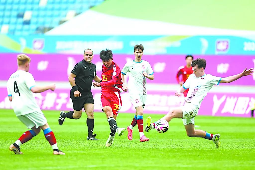 2024年國際中學(xué)生體育聯(lián)合會足球世界杯在遼寧省大連市舉行,中外球員角逐綠茵場。 遼寧省教育廳供圖