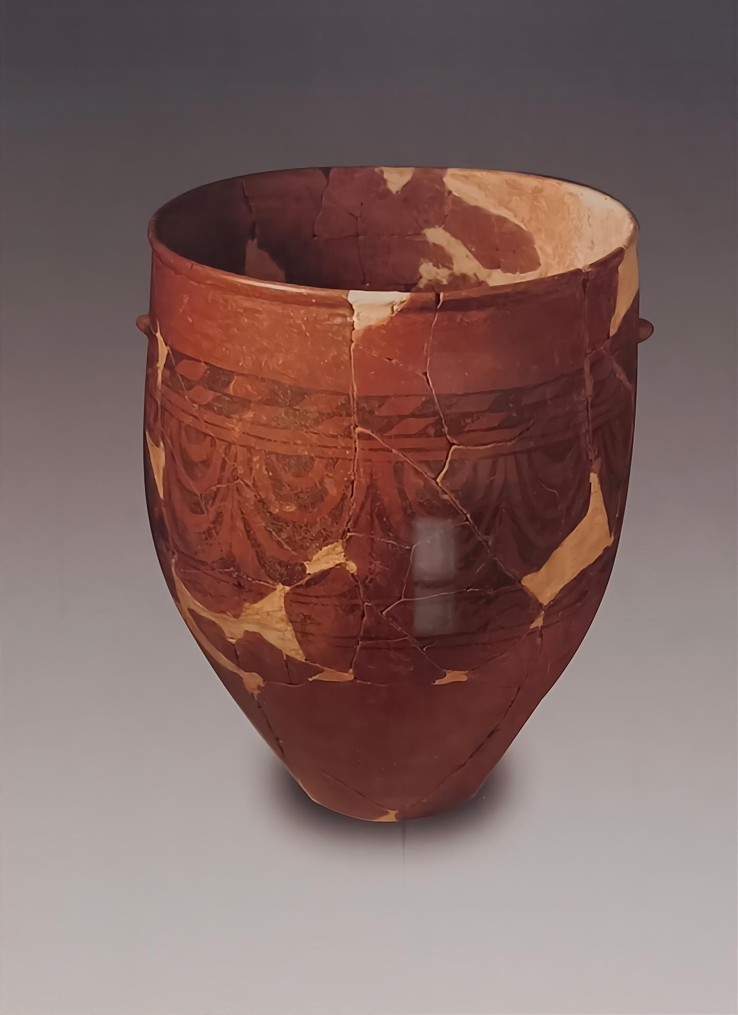 曾在赤峰博物館展出的紅山文化出土陶器中,還有一件融合了三種文化元素的陶罐,這就是20世紀(jì)70年代在赤峰市阿魯科爾沁旗紅山文化遺址中發(fā)掘出土的大型細(xì)泥紅陶彩繪平底筒形罐。它如同一部無聲的史詩,告訴世人在五千多年前的紅山,曾經(jīng)上演過怎樣的文明交融。