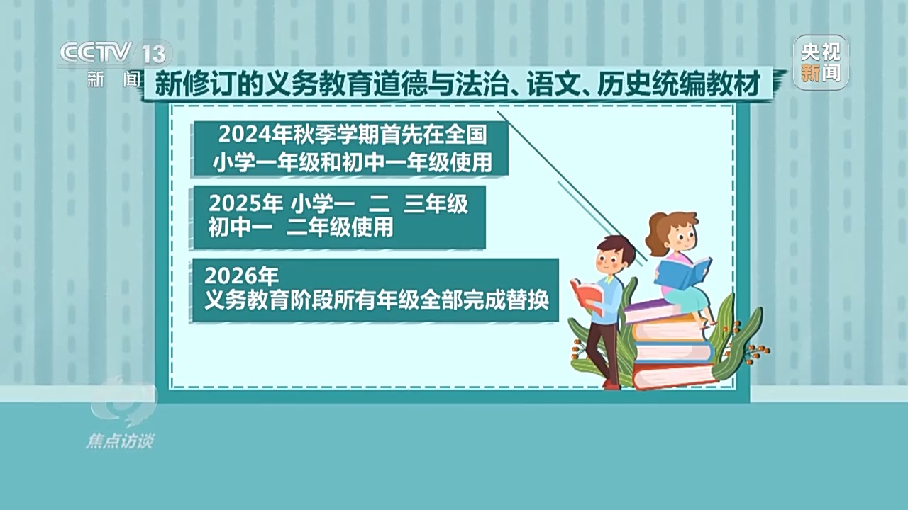 今年秋季學期,修訂后的教材在小學一年級和初中一年級投入使用;2025年,小學一、二、三年級和初中一、二年級使用;2026年,義務教育階段所有年級全部完成替換。
