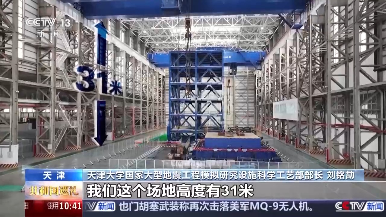 天津大學(xué)國家大型地震工程模擬研究設(shè)施科學(xué)工藝部部長 劉銘劼:我們這個場地高度有31米,跨度有43米,這部分區(qū)域的長度是120米。我們這個振動臺臺面尺寸20米乘16米,最大載重1350噸,大概是二十多輛重載卡車的重量。我們在滿載情況下可以運(yùn)行的最大加速度是2.0個重力加速度。這么大的加速度實際上已經(jīng)超過了我們9度烈度條件下的地震動的水平。