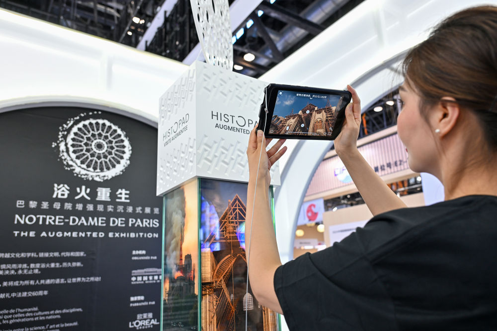 9月12日,法國國家館工作人員介紹“巴黎圣母院增強現(xiàn)實沉浸式展覽”。 新華社記者 李鑫 攝