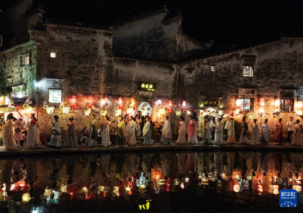 9月15日,花燈表演隊伍在安徽省黃山市黟縣宏村巡游(無人機照片)。