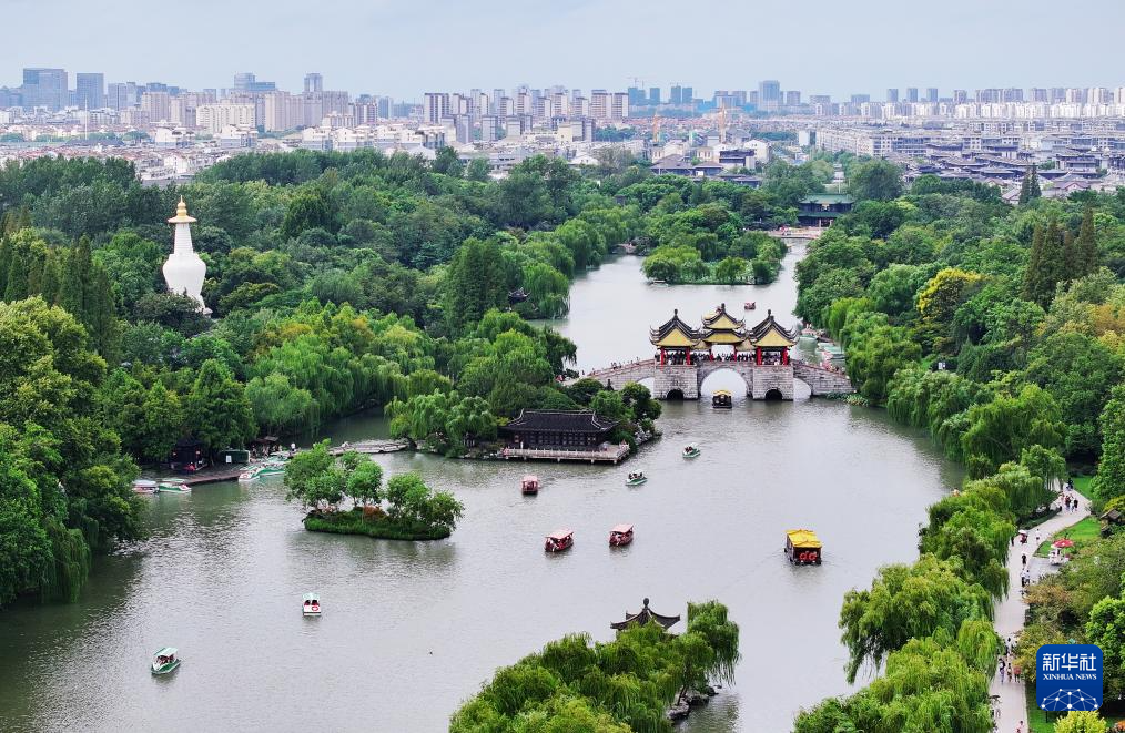 9月17日,游客在江蘇揚州瘦西湖風(fēng)景區(qū)游玩(無人機照片)。