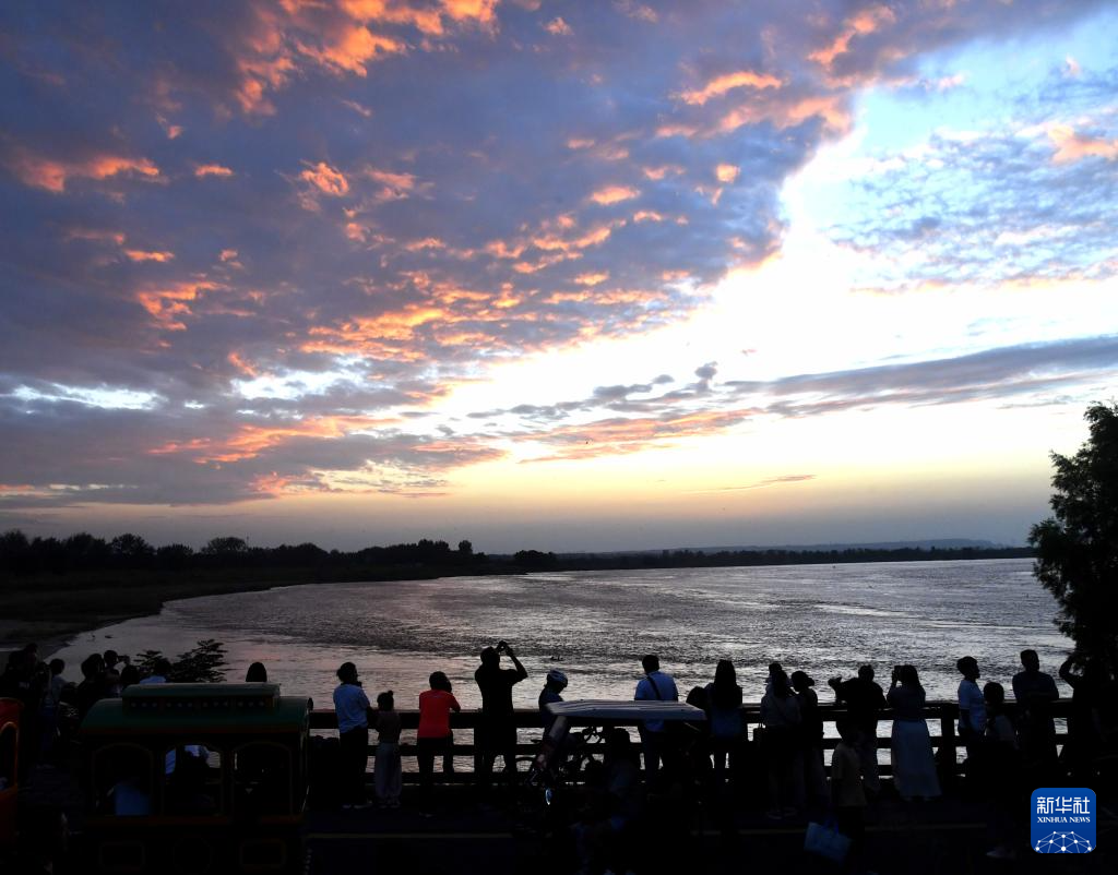 9月17日,鄭州黃河南裹頭廣場,游客觀賞晚霞。