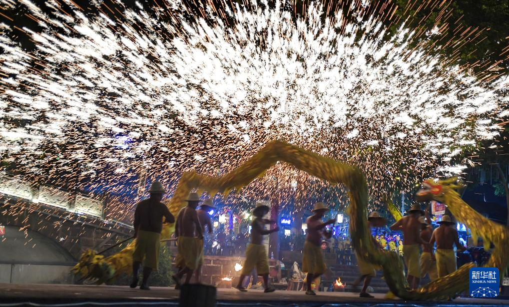 9月16日,四川省成都市雙流區(qū)黃龍溪古鎮(zhèn),當(dāng)?shù)厮嚾藶橛慰捅硌輫壹壏沁z“火龍燈舞”。