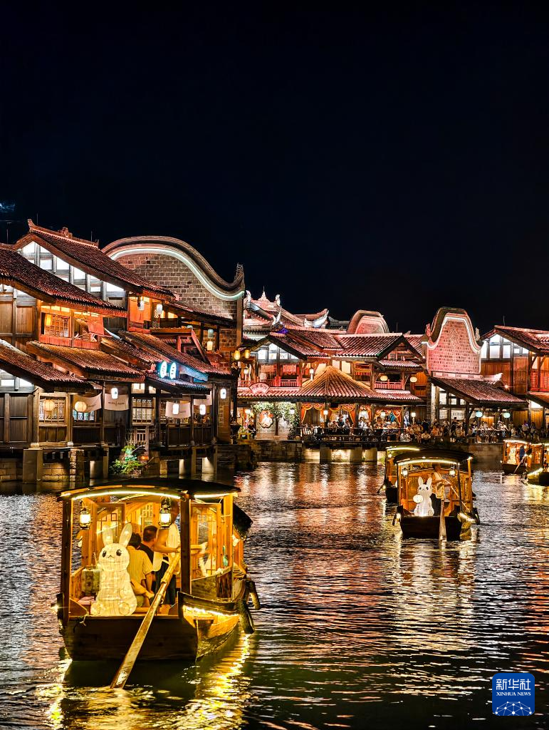 9月16日晚,在四川省宜賓市翠屏區(qū)李莊古鎮(zhèn),游客乘“玉兔船”泛舟慢游。