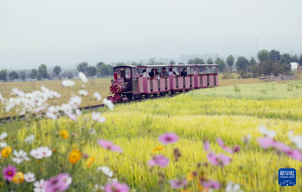9月15日,在河南省洛陽市汝陽縣三屯鎮(zhèn)東保村“稻田小鎮(zhèn)”,游客乘坐小火車在稻田旅游觀光。