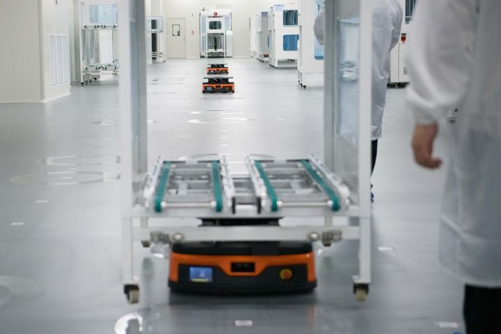 8月20日,在安徽華晟新能源科技股份有限公司的異質(zhì)結(jié)光伏電池及組件工廠內(nèi),搬運(yùn)機(jī)器人在作業(yè)中。
