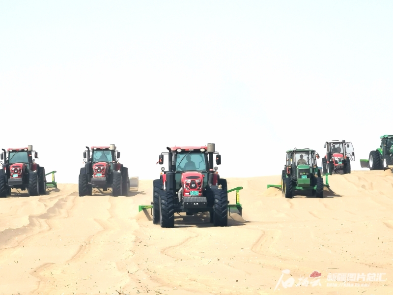 在后河壩二期治沙現(xiàn)場,亞森·奧斯曼聯(lián)合其他承包戶,集合了17輛拖拉機(jī)平整沙地。拖拉機(jī)一字排開向前推進(jìn),場面非常壯觀。