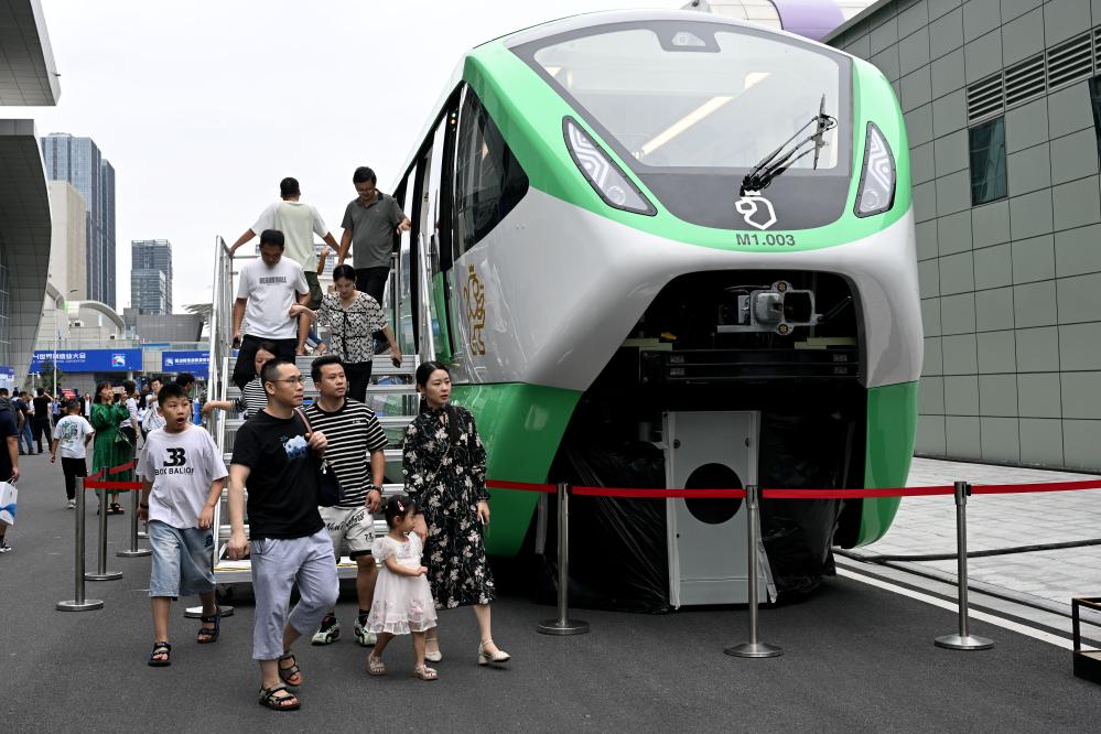 9月21日,在2024世界制造業(yè)大會上,人們參觀體驗一款跨座式單軌列車。新華社記者 黃博涵 攝