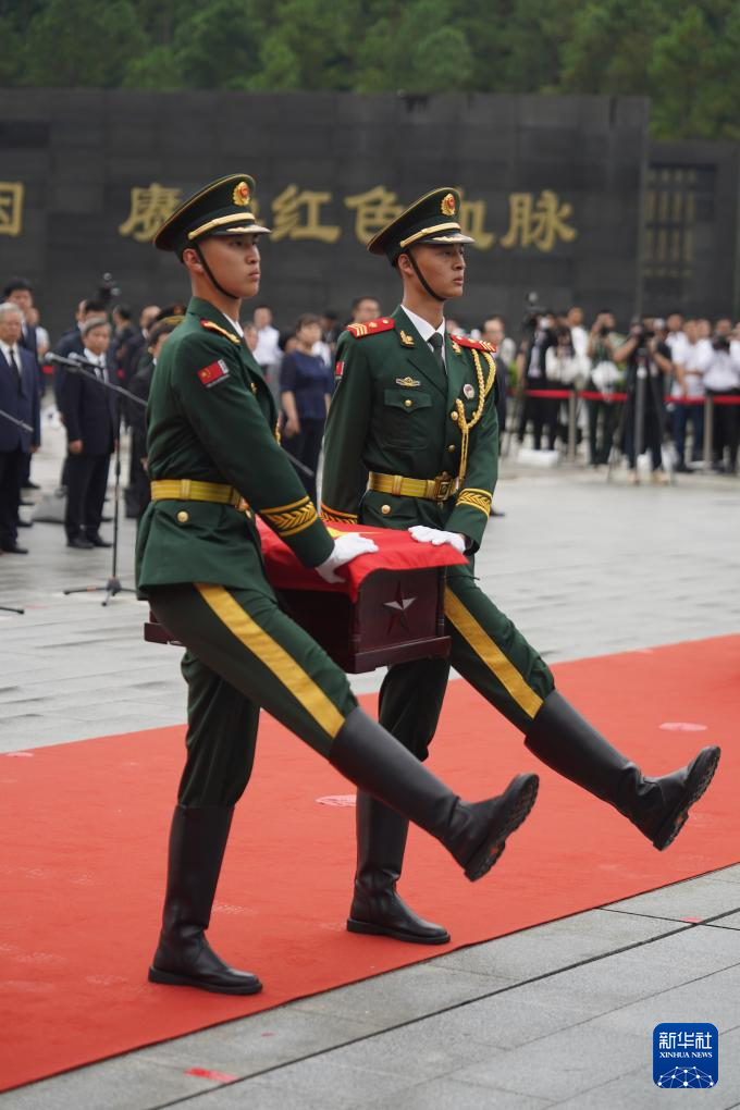 隨著《思念曲》響起,在2名禮兵持槍護衛(wèi)下,2名禮兵護送黃公略烈士棺槨緩緩步入現(xiàn)場。全場奏唱中華人民共和國國歌。全體人員脫帽肅立,向烈士默哀。18名禮兵鳴槍3響,向烈士致敬。