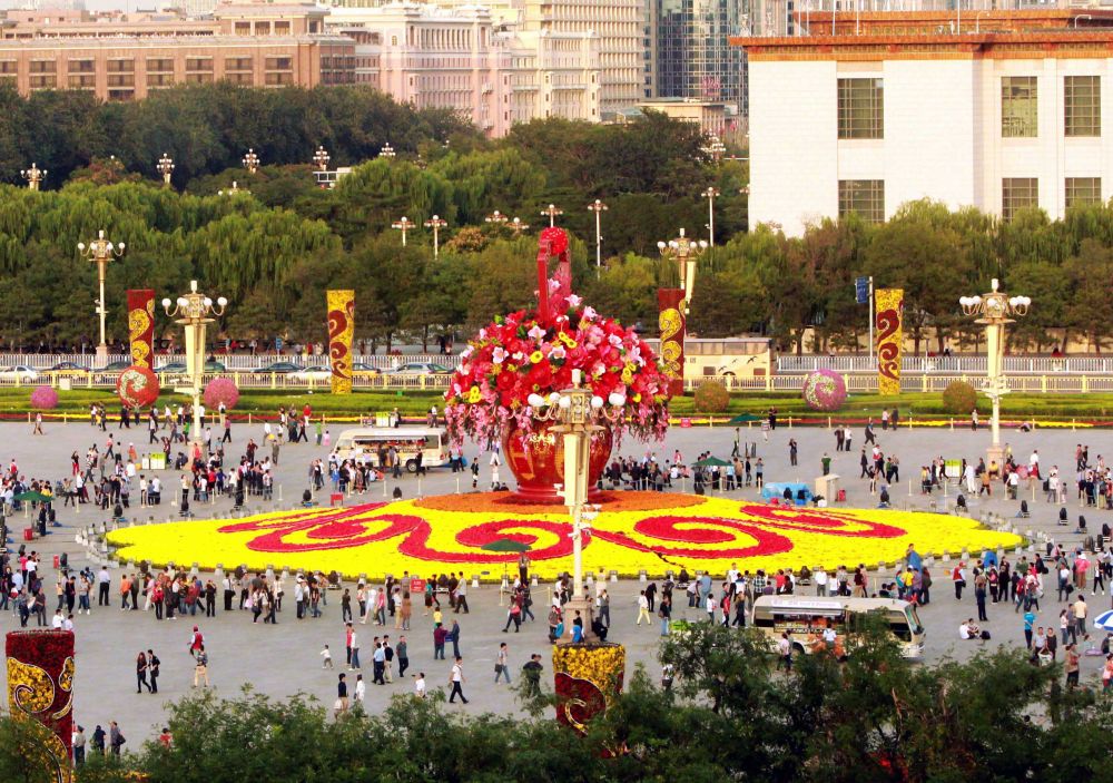 1992年國(guó)慶前夕,由17萬(wàn)盆鮮花擺成的15組大型花壇出現(xiàn)在北京天安門廣場(chǎng)。新華社記者 宋連峰 攝