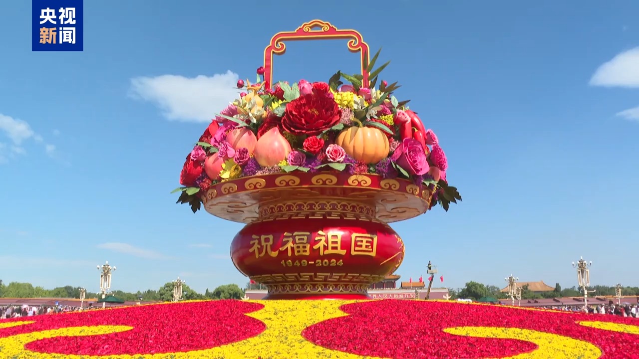 “祝福祖國(guó)”大型花壇以喜慶的蔬果花籃為主景,花壇頂高18米,籃體高16米,籃盤直徑12米。花壇底部直徑45米,為如意圖案,寓意吉祥如意、國(guó)泰民安。今年的花壇首次以“蔬果花籃”呈現(xiàn),籃內(nèi)選取了美好寓意的蔬果和花卉,體現(xiàn)“蔬果飄香,繁花似錦”。