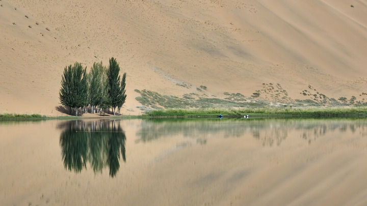 驅(qū)車深入巴丹吉林沙漠,翻過(guò)數(shù)不盡的沙丘,來(lái)到水草豐美的廟海子。這里四面環(huán)沙山,一座200多年前的白墻金頂寺廟坐落在湖邊,為雄渾壯闊的自然景象抹上一筆濃厚人文氣息。觀者無(wú)不感嘆,當(dāng)年交通不便,如何在沙漠腹地建成如此精美的建筑。