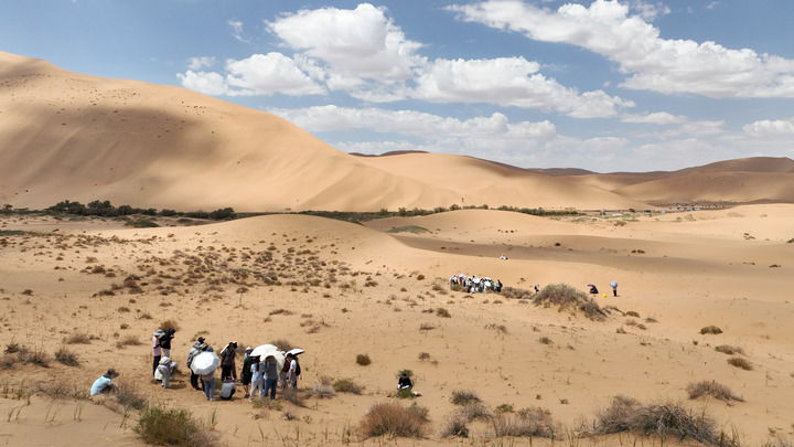 2024年7月31日,來(lái)自蘭州大學(xué)、香港浸會(huì)大學(xué)、西南大學(xué)等18所高校的100余位師生在巴丹吉林沙漠開(kāi)展“發(fā)現(xiàn)計(jì)劃”地理學(xué)聯(lián)合實(shí)習(xí),這是部分師生在巴丹吉林沙漠中開(kāi)展植被樣方調(diào)查(無(wú)人機(jī)照片)。