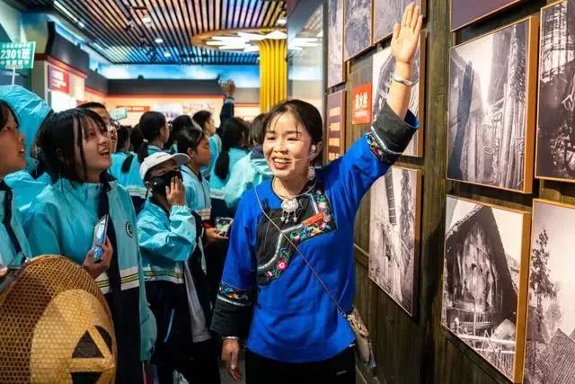 在湘西十八洞村,講解員施艷琴為游客們講解十八洞村的故事(2023年11月1日攝)。新華社記者 陳思汗 攝