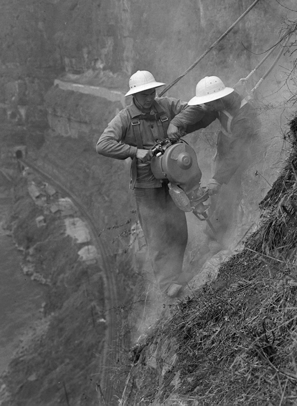 1974年3月,四川西昌鐵路分局烏斯河工務(wù)段工人排除大渡河兩側(cè)懸崖峭壁上的危巖和孤石,保證成昆鐵路安全通車。新華社記者 李基祿 攝