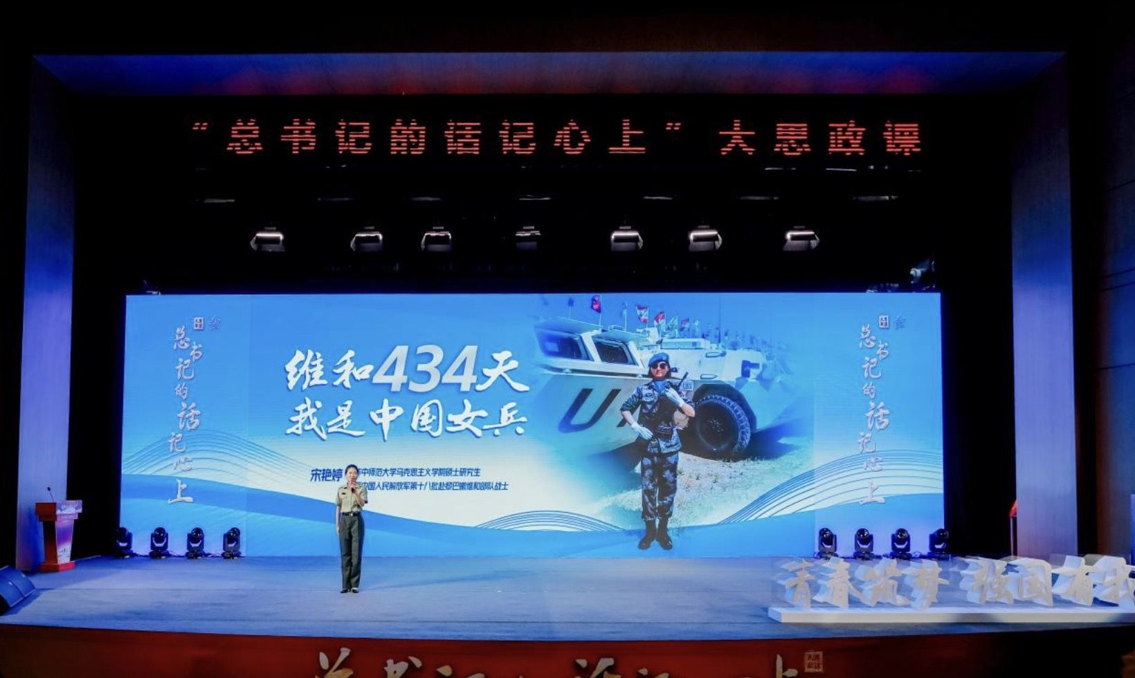 “大家好,我來(lái)自華中師范大學(xué)馬克思主義學(xué)院的宋艷婷!”9月24日,身著一身戎裝的宋艷婷身姿筆挺,在“總書(shū)記的話記心上”大思政課現(xiàn)場(chǎng),向廣大學(xué)子講述她的維和故事。一個(gè)干脆利落的敬禮,引起現(xiàn)場(chǎng)的熱烈掌聲。她曾作為第十八批赴黎巴嫩維和建筑工兵分隊(duì)隊(duì)員,在黎巴嫩執(zhí)行維和任務(wù)。
