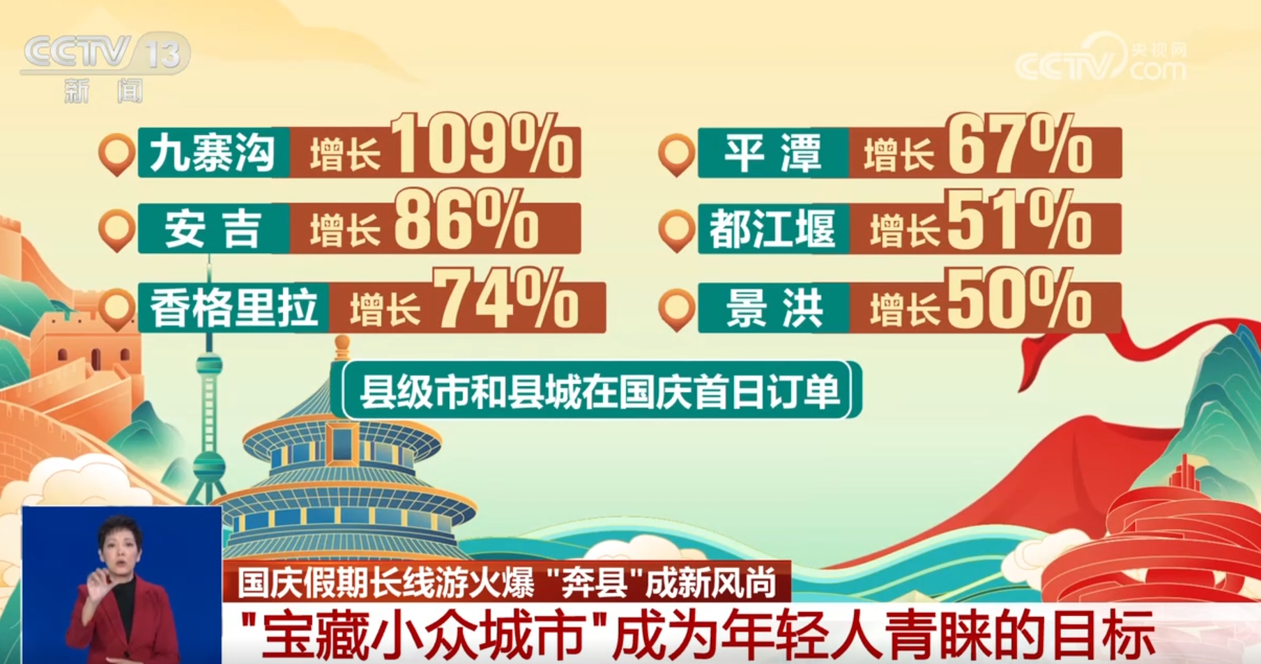 從增速上看,低線、小眾旅游目的地增長潛力巨大,“奔縣”旅游的人越來越多。九寨溝、安吉、香格里拉、平潭、都江堰、景洪等縣級市和縣城在國慶首日都分別實現(xiàn)訂單109%、86%、74%、67%、51%、50%的增長。