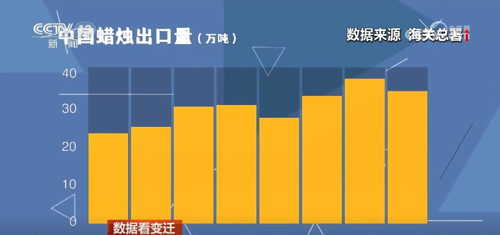 隨著電力普及,蠟燭在國內逐漸淡出人們的視線,但卻在海外大放異彩。近10年來,我國蠟燭年度出口量邁過30萬噸關口,和中國綠茶一年的出口量相當。中國蠟燭“漂洋過?!比ネ?60多個國家和地區(qū),穩(wěn)坐全球蠟燭貿易“頭把交椅”。國內蠟燭相關企業(yè)增加到約1.02萬家,近50%的企業(yè)成立于10年之內,傳統(tǒng)的蠟燭產品向高附加值邁進。