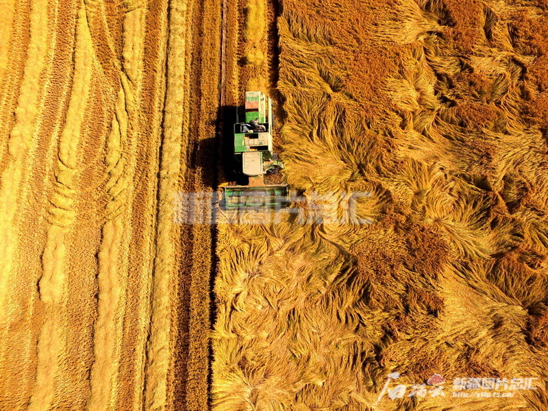 2016年10月11日,新疆生產(chǎn)建設兵團第一師原阿拉爾農(nóng)場職工在收割水稻。王志清攝