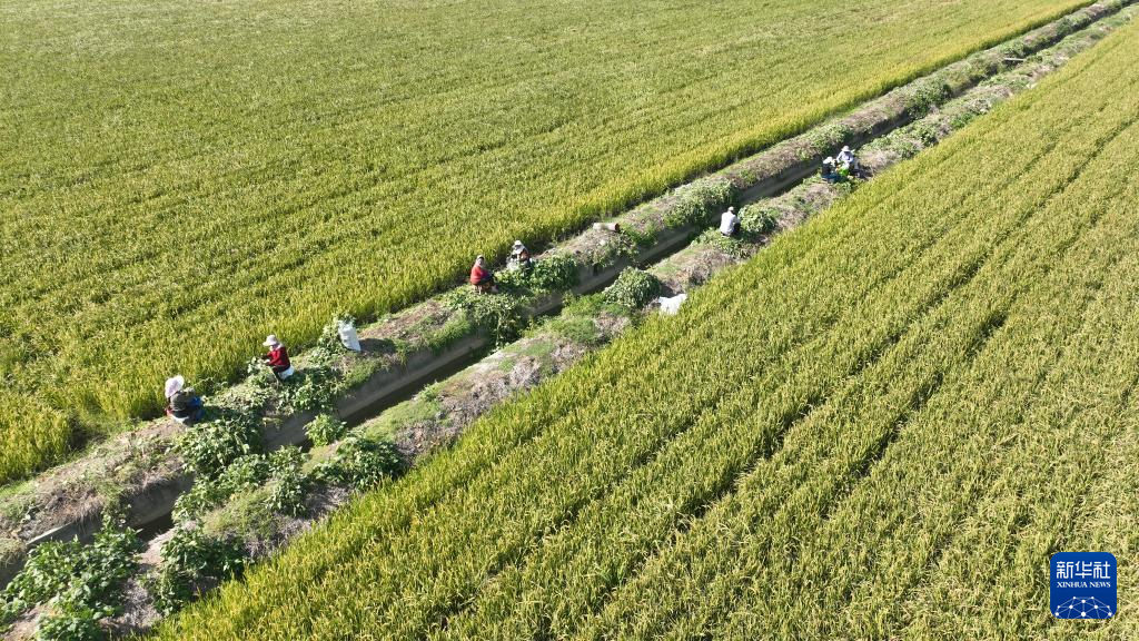 10月4日,江蘇省淮安市洪澤區(qū)農(nóng)民在采摘毛豆(無人機(jī)照片)。新華社發(fā)(萬震攝)