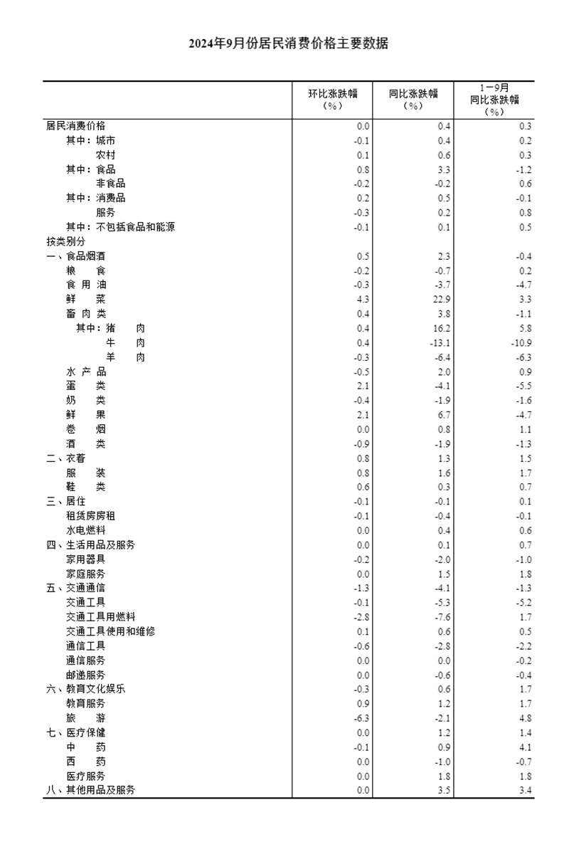 2024年9月份,全國居民消費(fèi)價(jià)格同比上漲0.4%。其中,城市上漲0.4%,農(nóng)村上漲0.6%;食品價(jià)格上漲3.3%,非食品價(jià)格下降0.2%;消費(fèi)品價(jià)格上漲0.5%,服務(wù)價(jià)格上漲0.2%。1—9月平均,全國居民消費(fèi)價(jià)格比上年同期上漲0.3%。