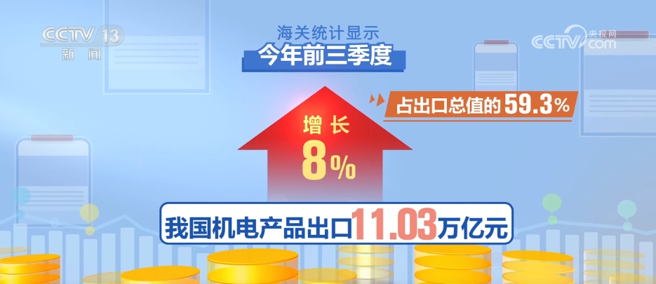 海關(guān)統(tǒng)計顯示,今年前三季度,我國出口產(chǎn)品結(jié)構(gòu)優(yōu)化,高端裝備出口增長超4成。機電產(chǎn)品出口11.03萬億元,增長8%,占出口總值的59.3%。其中,高端裝備出口增長43.4%,集成電路、汽車、家用電器出口分別增長22%、22.5%、15.5%。此外,傳統(tǒng)勞動密集型產(chǎn)品出口3.13萬億元,增長2.8%。
