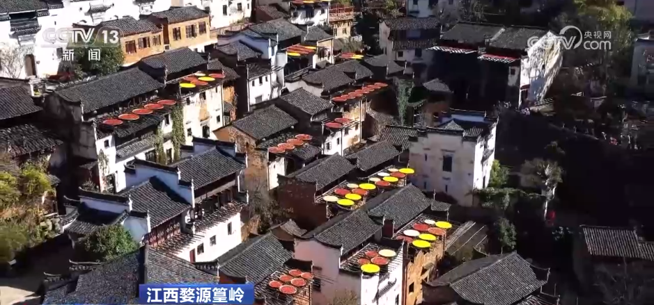 在江西婺源篁嶺,多種農(nóng)產(chǎn)品和徽派建筑對比鮮明,共同構(gòu)成了婺源獨(dú)特的“曬秋”景觀。優(yōu)質(zhì)的生態(tài)環(huán)境孕育了“紅、綠、黑、白、黃”五大特色物產(chǎn),“曬秋”成為“中國最美鄉(xiāng)村”的特有名片。