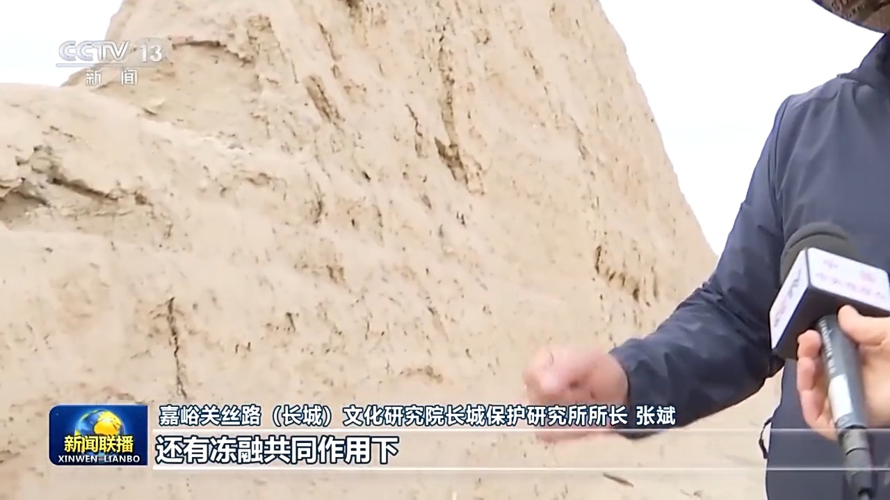 嘉峪關絲路(長城)文化研究院長城保護研究所所長 張斌:這塊就是風雪,還有凍融共同作用下,形成一個很深的掏蝕凹槽,可能掏蝕進去20多公分,所以我們通過對它進行日常維護,就是對它進行夯補,它這個墻體的穩(wěn)定性就好了。