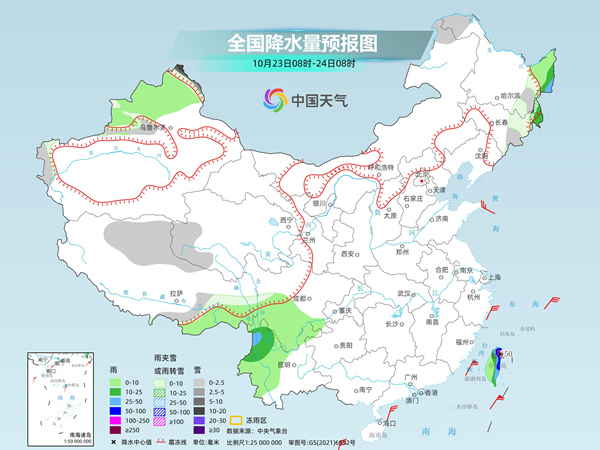 后天,新疆沿天山地區(qū)和南疆西部山區(qū)、西藏北部、青海中南部、川西高原北部等地部分地區(qū)有小到中雪或雨夾雪。云南西北部、臺灣島大部等地部分地區(qū)有中到大雨,其中,臺灣島中東部等地部分地區(qū)有暴雨或大暴雨(100~200毫米)。