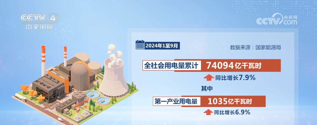 數(shù)據(jù)顯示,今年1至9月,全社會用電量累計74094億千瓦時,同比增長7.9%。其中,第一產(chǎn)業(yè)用電量1035億千瓦時,同比增長6.9%;第二產(chǎn)業(yè)用電量47385億千瓦時,同比增長5.9%;第三產(chǎn)業(yè)用電量13953億千瓦時,同比增長11.2%;城鄉(xiāng)居民生活用電量11721億千瓦時,同比增長12.6%。