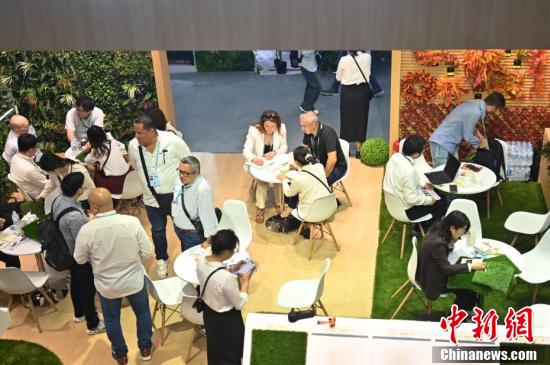 第136屆廣交會(huì)第二期的園林用品展區(qū)吸引采購(gòu)商(左)咨詢洽談。