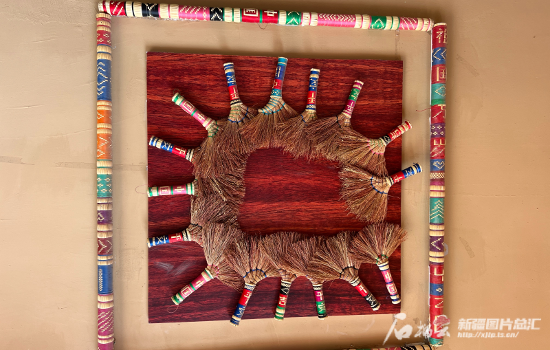 疏附縣托克扎克鎮(zhèn)阿亞格曼干村手工掃把工藝坊里,村民依巴古麗·阿布都克然用掃把做的旅游紀念品。石榴云/新疆日報記者 拍熱扎提·阿不都攝