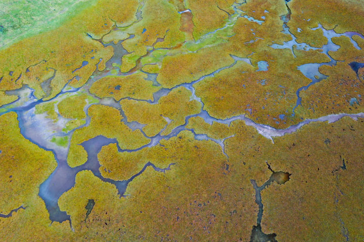 這是2022年9月17日在甘肅省甘南藏族自治州瑪曲縣拍攝的黃河上游重要水源涵養(yǎng)地阿萬倉濕地內(nèi)的一處沼澤景觀。占地562萬畝的瑪曲濕地是世界上保存最完整的濕地之一,被譽為“黃河之腎”(無人機照片)。新華社記者 郎兵兵 攝