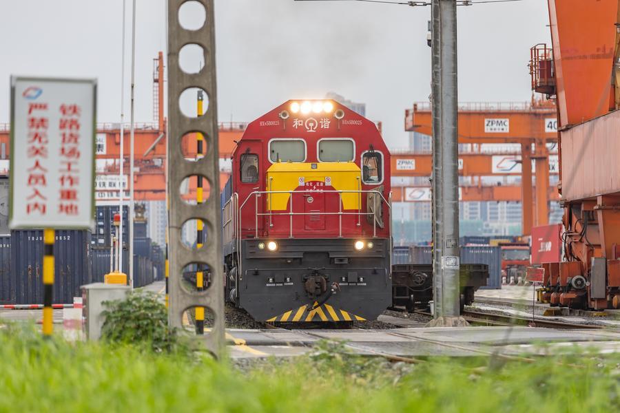 2024年7月30日,在重慶國際物流樞紐園區(qū),一列裝載機械設(shè)備、汽車和筆記本電腦的中歐班列從重慶團結(jié)村中心站駛出。新華社記者 黃偉 攝