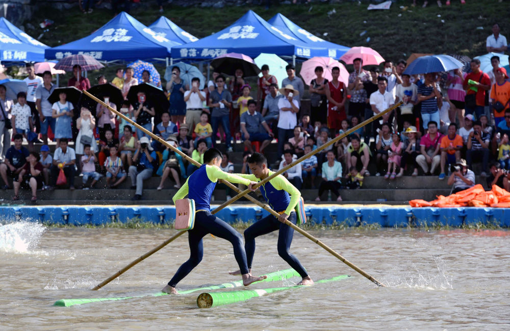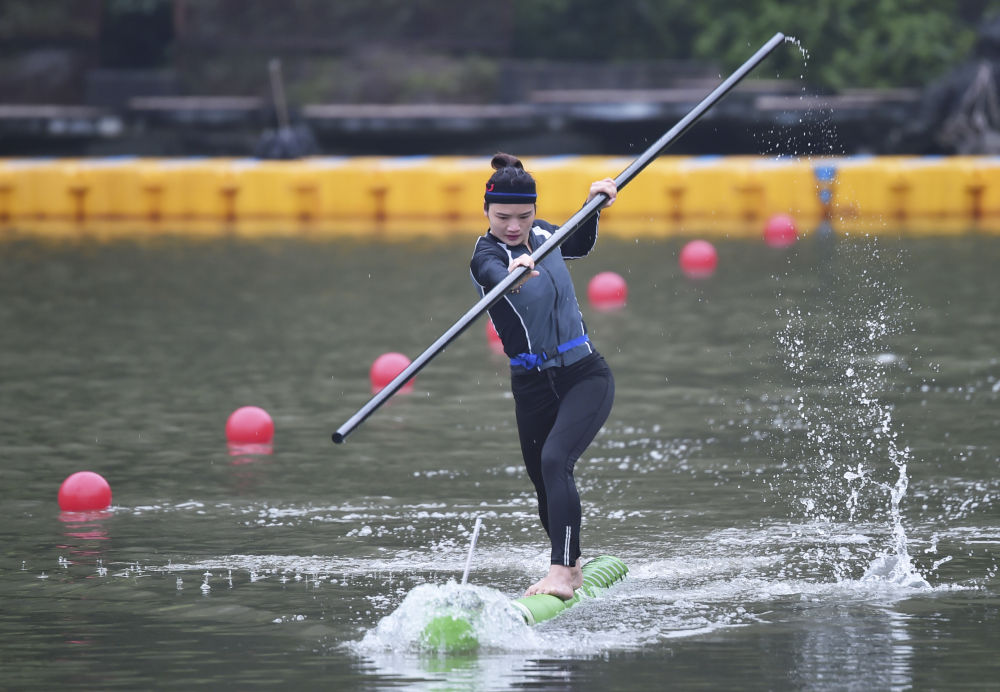 2019年4月4日,河池學(xué)院獨(dú)竹漂隊(duì)的隊(duì)員在廣西桂林市舉行的“民族體育炫”系列比賽中參加獨(dú)竹漂項(xiàng)目的比賽。