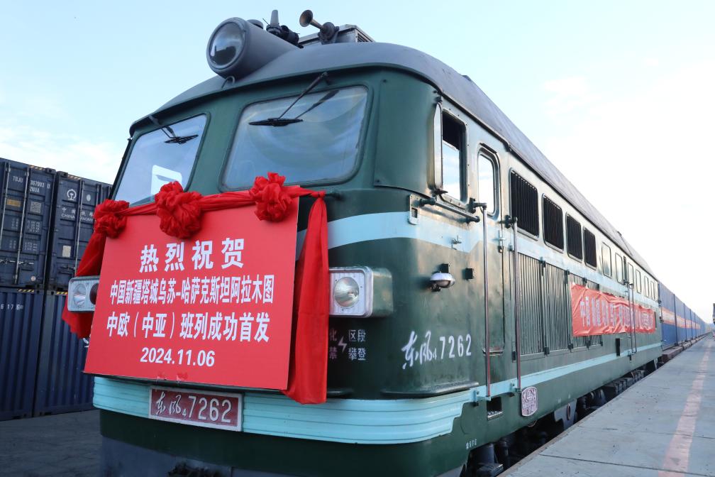 11月6日,在新疆塔城地區(qū)烏蘇鐵路貨場,中國新疆塔城烏蘇—哈薩克斯坦阿拉木圖中歐(中亞)班列首發(fā)。新華社記者 初杭 攝