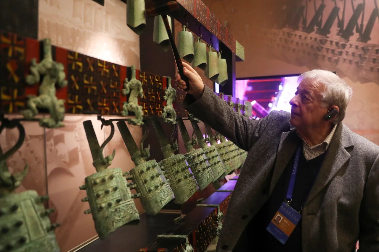 2024年11月6日,北京,專家學者在中國考古博物館體驗編鐘。張祥毅 攝