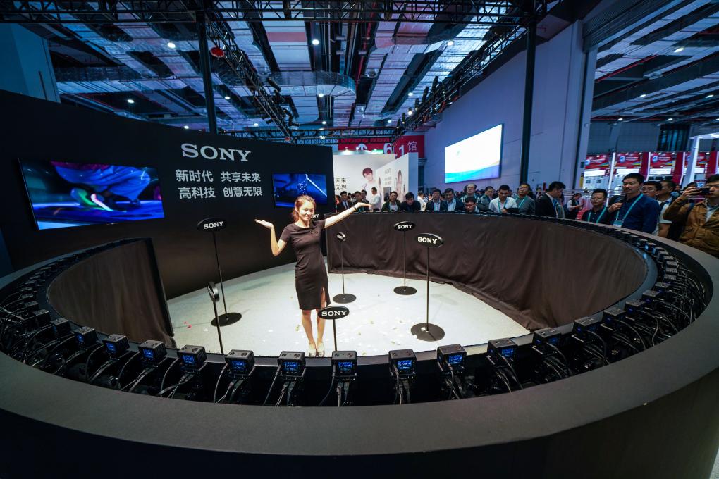 2018年11月6日,一名體驗者在首屆進博會索尼公司展臺體驗“子彈時間”拍攝。新華社記者 王建華 攝