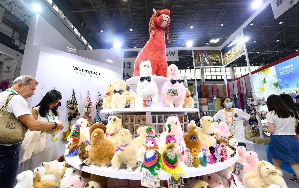 2021年5月7日,在海南??谂e行的首屆中國國際消費品博覽會(簡稱“消博會”)上,人們在秘魯“溫暖駝”展位參觀。