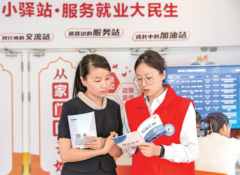 零工市場是向靈活就業(yè)人員與用工主體提供就業(yè)服務的重要載體。圖為2024年9月3日,江蘇省南通市通州區(qū)萬達廣場“零工驛站”內,就業(yè)服務人員在向求職者介紹就業(yè)創(chuàng)業(yè)政策。人民圖片 翟慧勇/攝